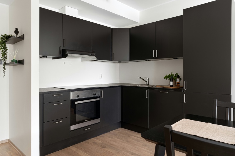 A: Black matte cabinets are suitable for small kitchens, as long as light-colored countertops, walls and floors are chosen, and proper lighting is provided, they are well-suited for small kitchens.