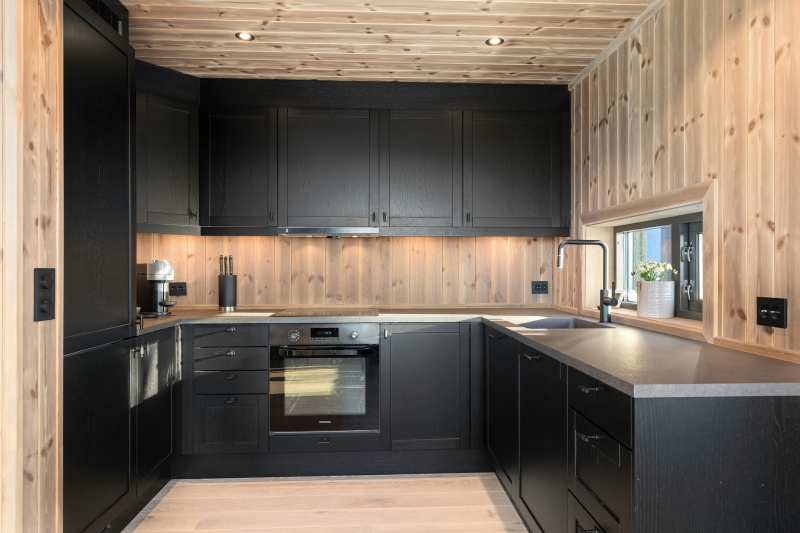 Black cabinets are also very popular, thanks to their high-end texture—many projects opt for custom painted black oak shaker kitchen cabinets. Moreover, black cabinets are highly stain-resistant, making them friendly for those who use the kitchen frequently. For hotel apartments that require frequent cleaning, black cabinets are also a top choice, as stains are less noticeable if not cleaned immediately. Oak cabinets also have a longer service life, making them suitable for high-end commercial projects. Even in large kitchen spaces, black oak shaker cabinets won’t make the area feel oppressive.