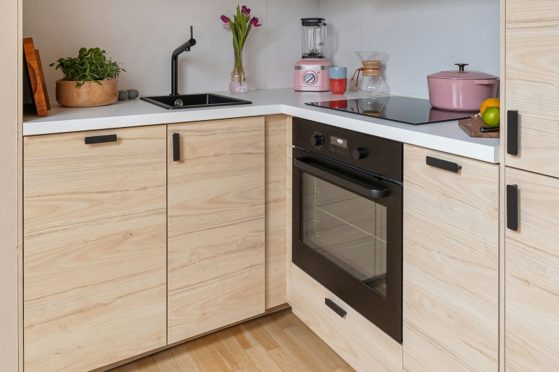 A: Absolutely. Black hardware forms a distinct yet balanced contrast with the warm wood tone of oak cabinets, enhancing the sense of sophistication.