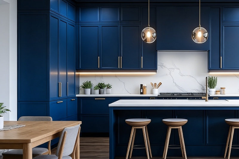 Pair with white or light gray tile walls, or wood veneer wall panels to balance the visual intensity of the blue. For soft furnishings, choose light-colored tableware, green plants, and fabric curtains to enrich the spatial layers and create a warm atmosphere.