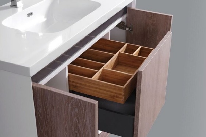 Since New European-Style Bathroom Vanities are frameless by design, the entire vanity has a smooth appearance. For this reason, some people think installing visible handles would look obtrusive, so they opt for concealed-handle bathroom vanities. The middle drawer is also equipped with a storage rack, which can hold small frequently used items for classification, allowing easy access just by opening the drawer.