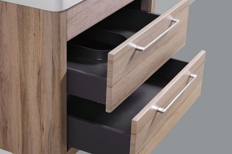 Some people find it convenient to open vanity cabinet doors with handles, so they prefer bathroom vanities equipped with handles. These vanities also feature a sliding drawer in the middle, making it easy to access items. The left and right cabinet doors are fitted with hidden European hinges, and the internal storage space is particularly wide and tall—suitable for placing large-sized toiletries.